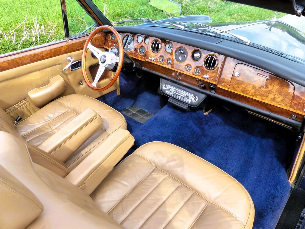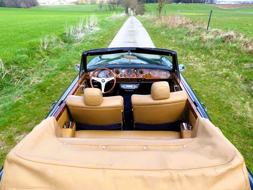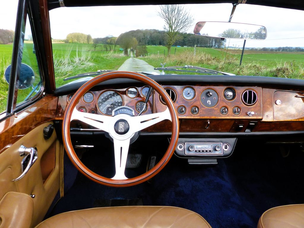 Unser Rolls-Royce Silver Shadow Drophead Coupé stammt aus dem Baujahr 1967, ist also eine ganz frühe Ausführung. In diesem Oldtimer mit seinem dunkelblauen Lack und der Innenausstattung in cognac-farbenem Leder mit dem herrlichen Edelholz-Armaturenbrett fühlt man sich wie in einem eng-lischen Herrenzimmer.